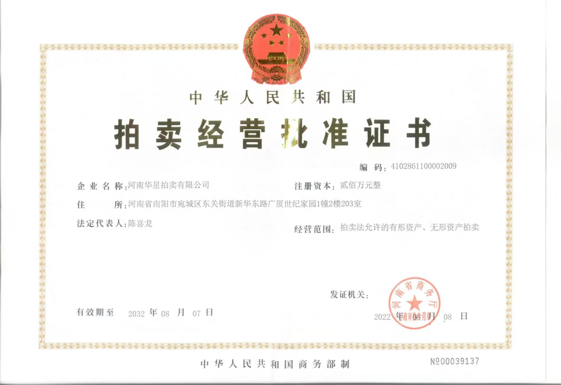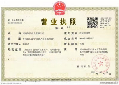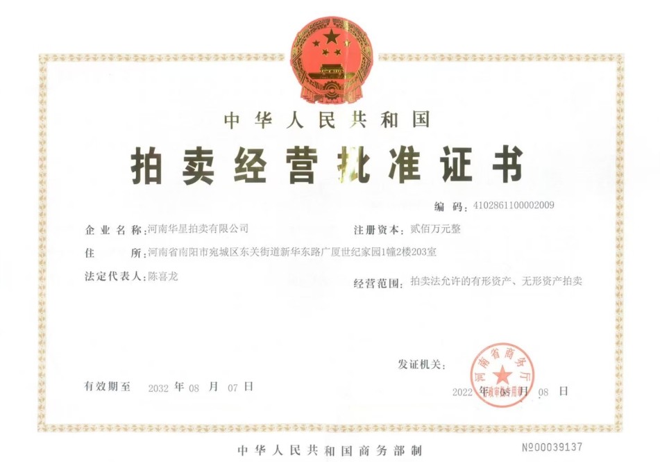 2013年7月取得南陽(yáng)市人民政府指定、河南省財(cái)政廳頒發(fā)河南省公物拍賣資格證書